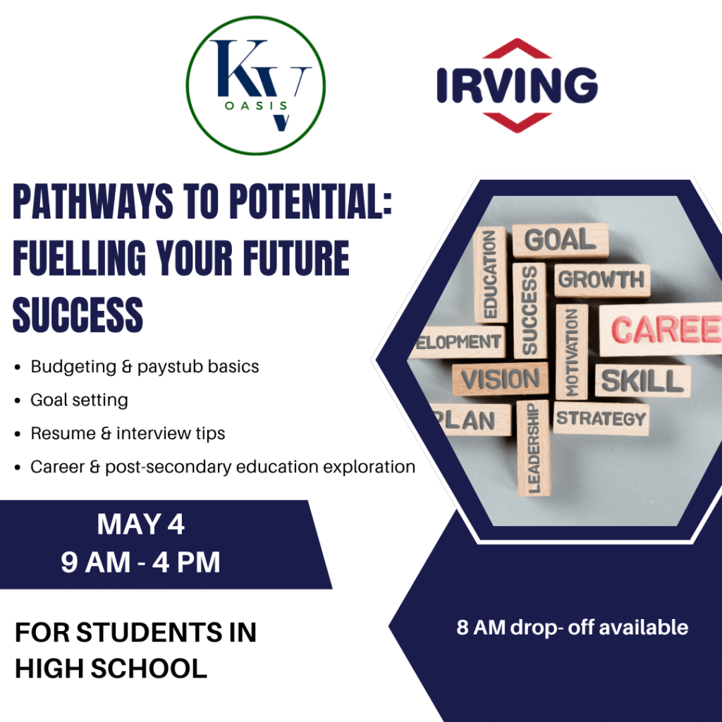 Join us on May 4, from 9 a.m. to 4 p.m. for Pathways to Potential, hosted at KV Oasis — a full-day workshop in partnership with Irving Oil designed to help students feel confident and prepared for summer jobs, volunteering and future careers.