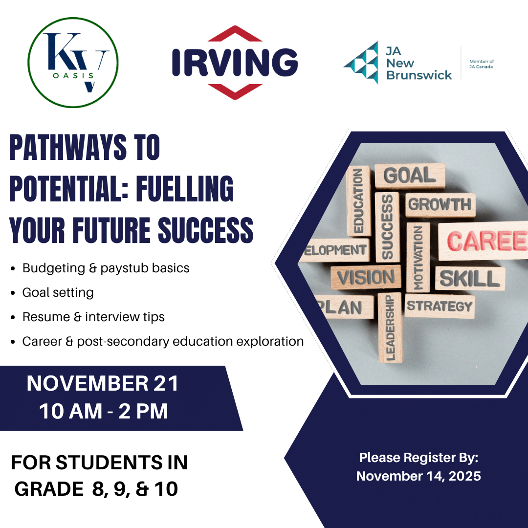 KV Oasis Youth Centre 221 Hampton Road - Unit 4, Quispamsis, NB, CanadaEmpower Your Future with KV Oasis and Irving Oil Join us on November 21 (a PD Day for students) from 10 am to 2 pm for our Pathways To Potential:…